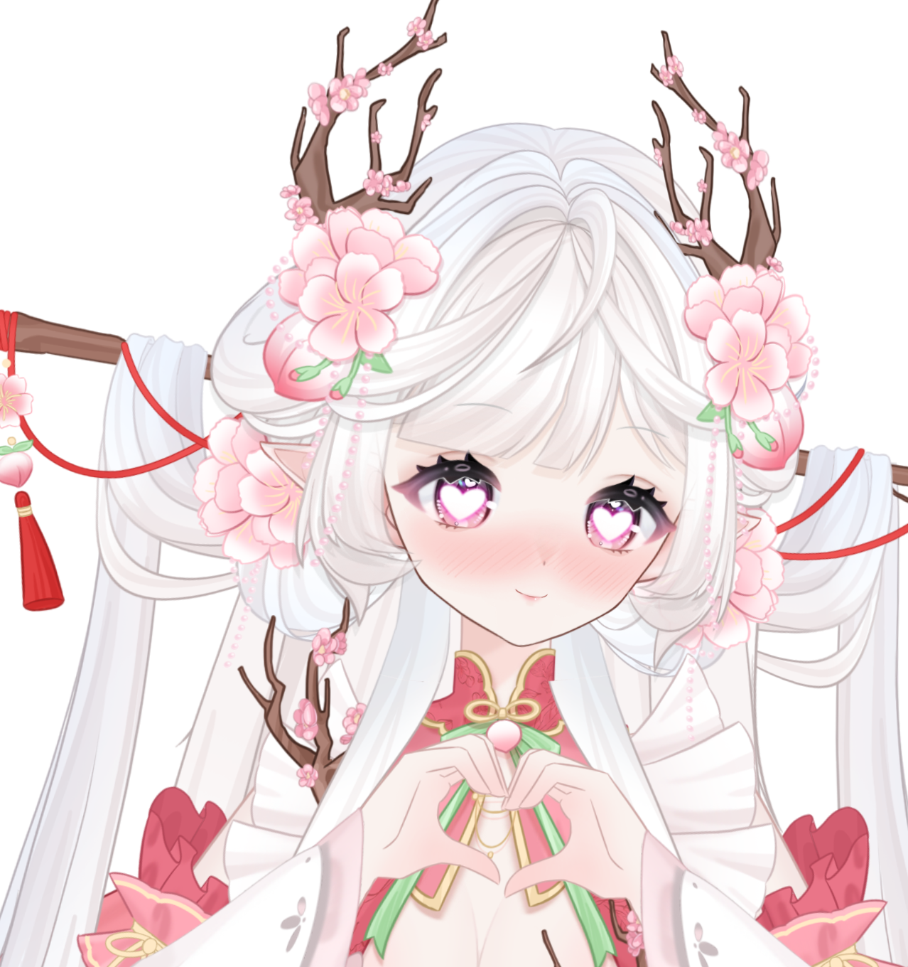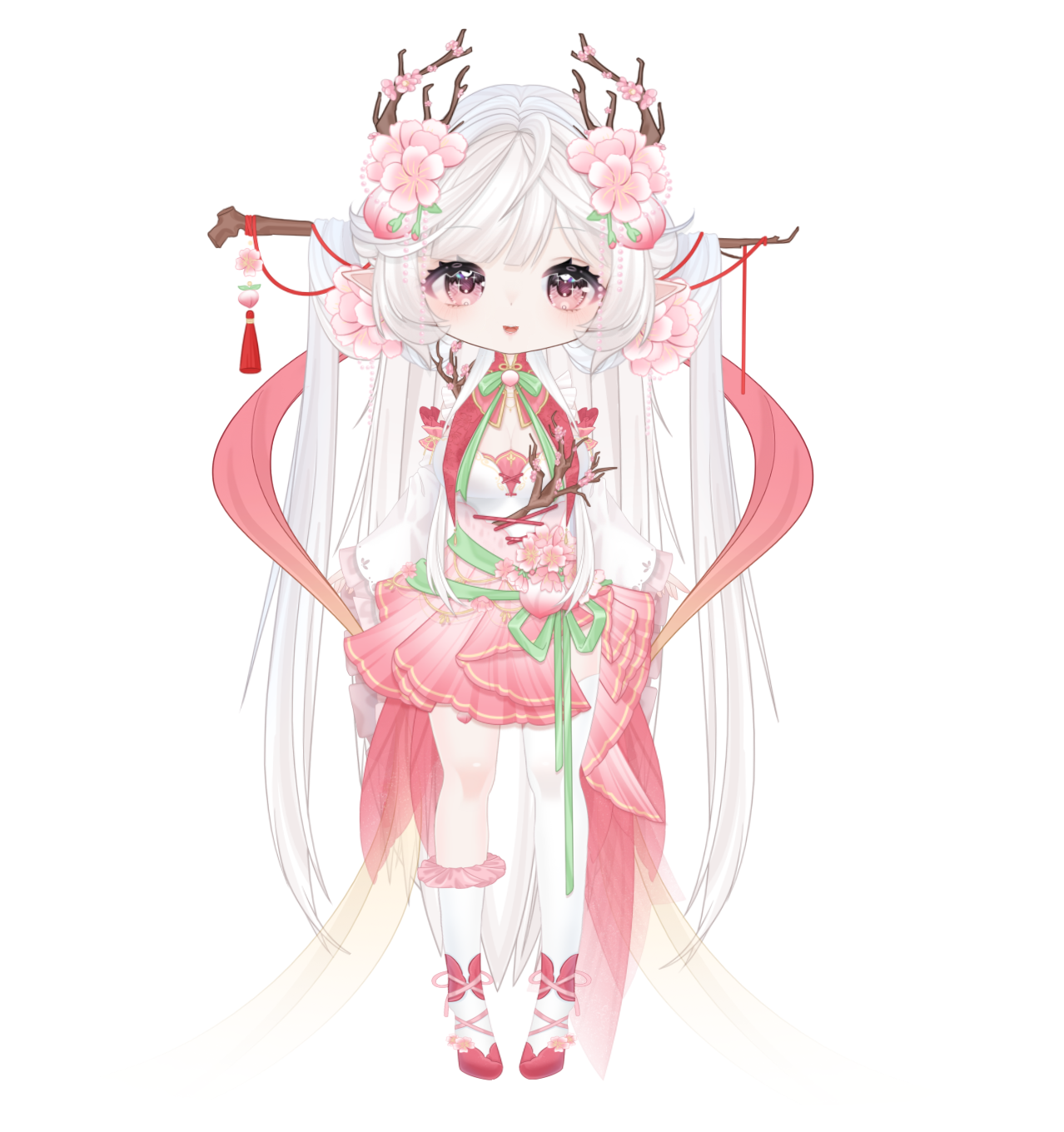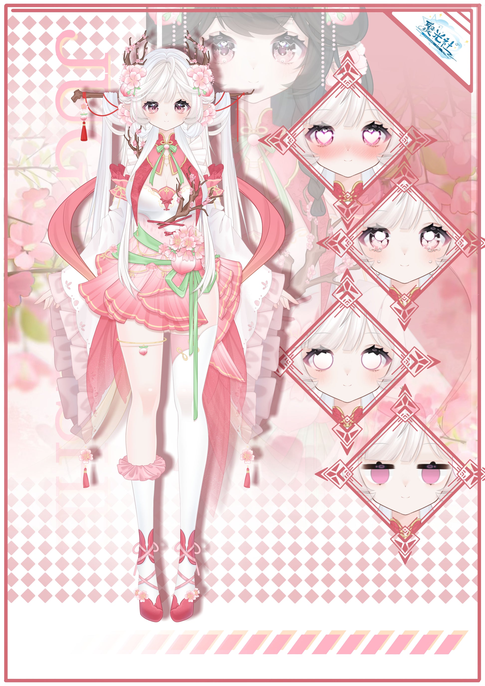 Taomin embodies the gentle beauty of spring. With her white-pink hair, delicate antlers, and cherry blossom adornments, she resembles a nature goddess dancing among petals and breeze. Her kimono-inspired outfit blends traditional grace with a playful modern flair. The layered fabrics, ribbons, and floral details give her an ethereal, soft presence.