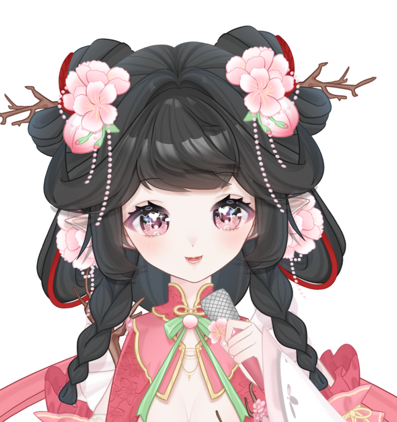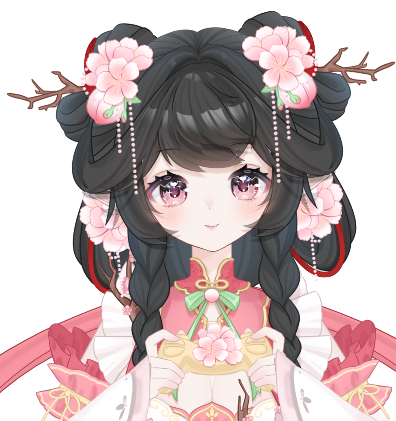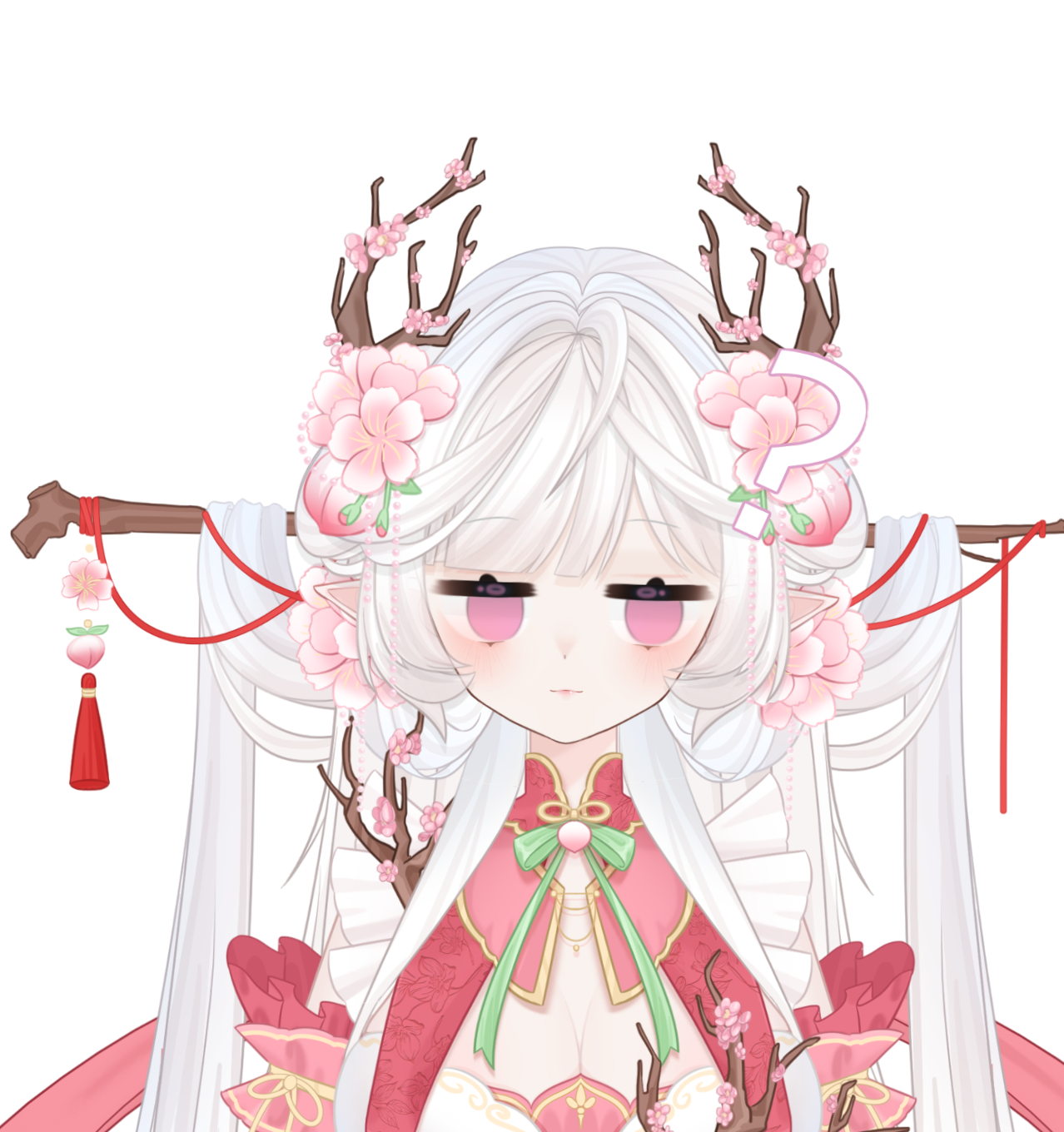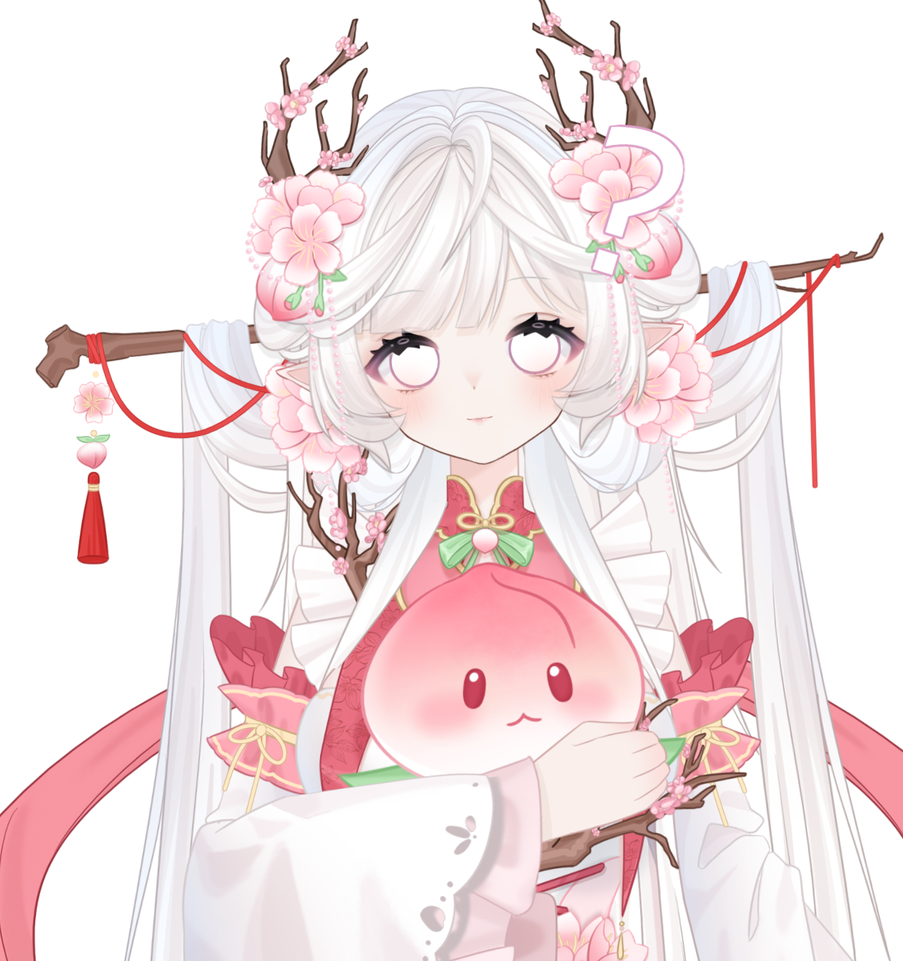 Taomin embodies the gentle beauty of spring. With her white-pink hair, delicate antlers, and cherry blossom adornments, she resembles a nature goddess dancing among petals and breeze. Her kimono-inspired outfit blends traditional grace with a playful modern flair. The layered fabrics, ribbons, and floral details give her an ethereal, soft presence.